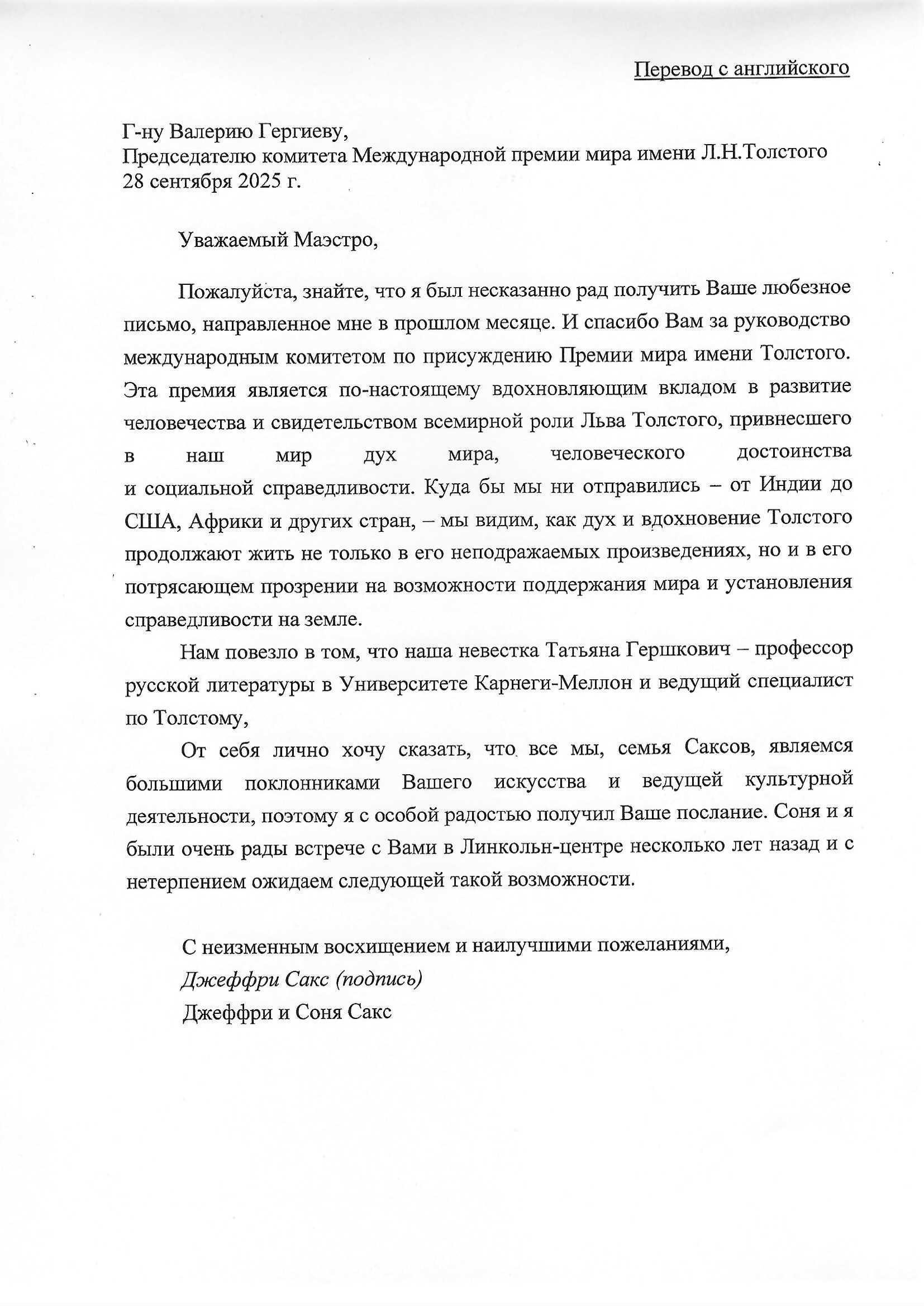 Ответ американского политолога Джеффри Сакса на обращение Председателя Жюри Международной Премии мира имени Л.Н.Толстого Валерия Гергиева.