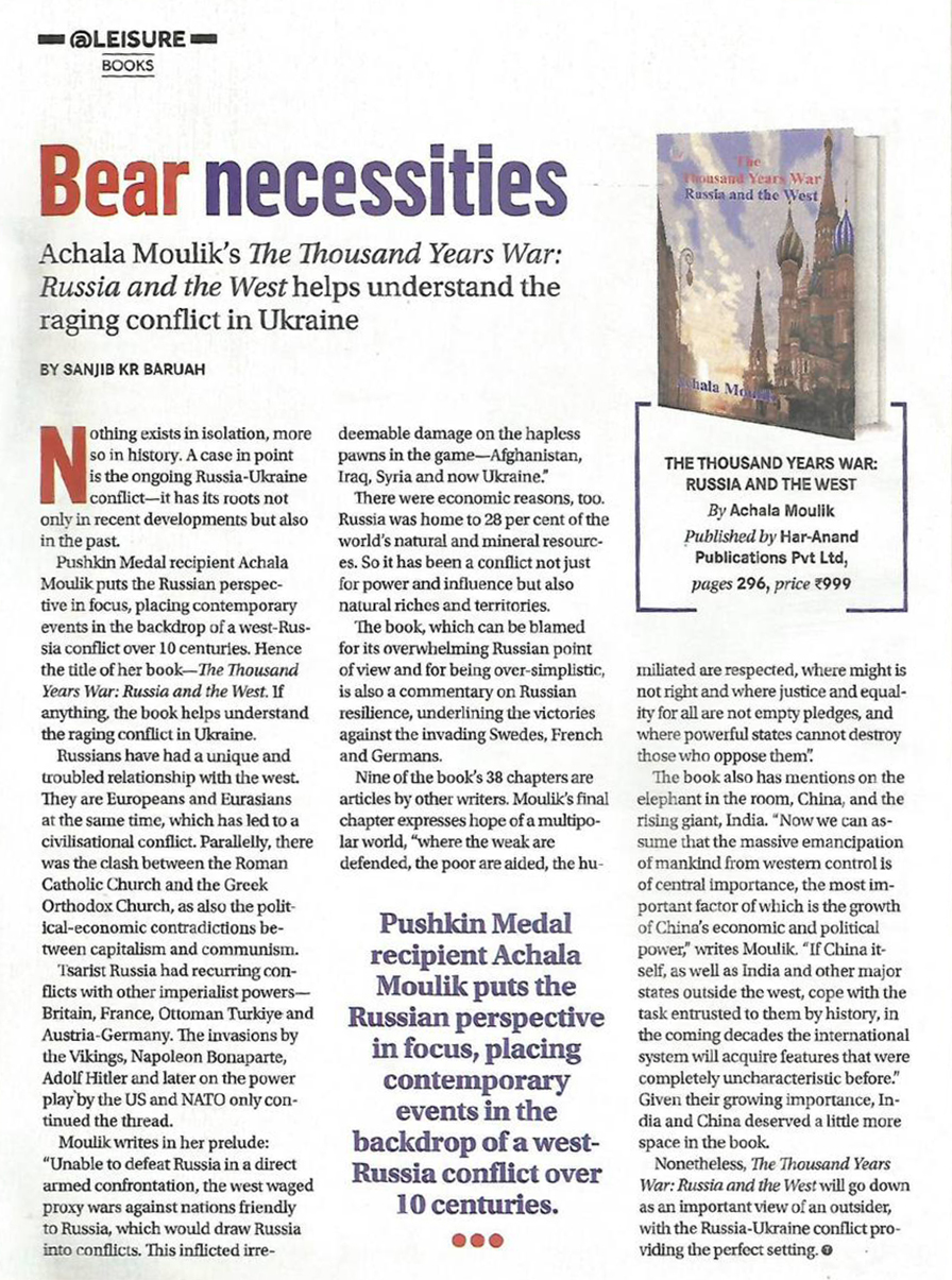 Член Жюри Международной премии мира имени Л.Н.Толстого, лауреат Пушкинской медали Ачала Моулик акцентирует внимание на российской перспективе, помещая современные события на фоне конфликта между Западом и Россией, длившегося более 10 столетий. Отсюда и название книги - "Тысячелетняя война: Россия и Запад". Во всяком случае, книга помогает лучше понять суть конфликта на Украине.